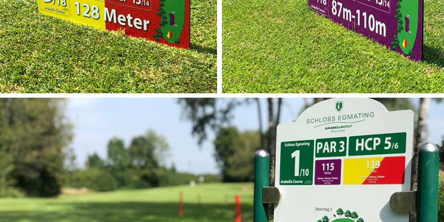 Neue Abschlagtafeln und Abschlagschilder auf dem Arabella Course. Für das tägliche, entspannte Spiel mit 9 Par 3 Löchern können Sie die lila Abschläge nutzen. Wer eine vorgabewirksame Runde spielen möchte oder an einem Turnier teilnimmt, startet von den gelb/roten Abschlägen.