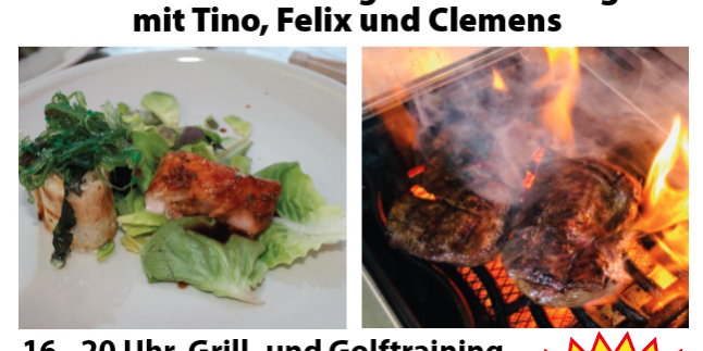 Wer sowohl an seinem Golfspiel als auch an seinen BBQ Künsten am Grill arbeiten möchte, bekommt am Montag den 10.08. die Gelegenheit dazu. Die Profis von Mygrill grillen it Euch zusammen ein 3-Gänge Menü. Zwischen den Mahlzeiten wird zusammen mit den SMARTGOLF Pros von unserer Golfschule das Golfspielen verbessert. Anmeldung über das Sekretariat im Golfclub Schloss Egmating oder online. Meldeschluss ist Freitag 16 Uhr. Hier klicken für Online Anmeldung