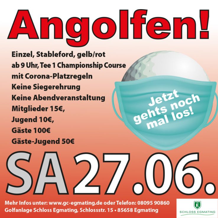 Angolfen am Samstag 27. Juni Neuer Versuch bei super Wettervorhersagen. 18 Loch Stableford von gelb/rot auf dem Championship Course. Gespielt wird mit den Corona-Golf-Sonderregeln auf dem Platz. Im Anschluß ist keine Siegerehrung oder Abendveranstaltung. Anmeldung bitte über das Sekretariat oder online anmelden.
