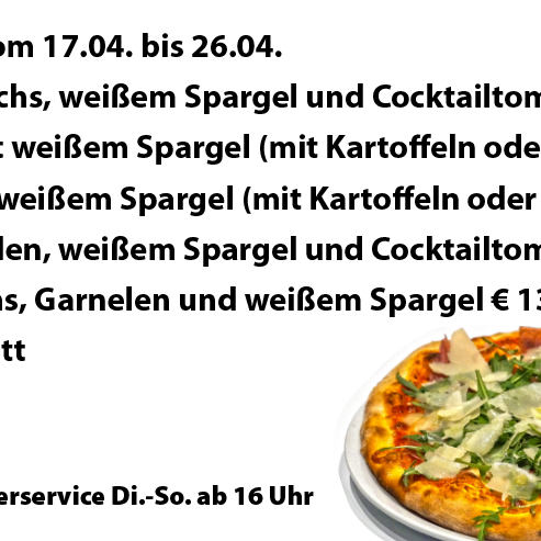 Das Restaurant ist für Abholung oder Lieferung der Speisen vonDienstag bis Sontag ab 16 Uhr geöffnet. Wochenkarte vom 17.04. bis 26.04. Linguine mit Lachs, weißem Spargel und Cocktailtomaten € 12,90 Rinderlende mit weißem Spargel (mit Kartoffeln oder Salat) € 16,90 Zanderfilet mit weißem Spargel (mit Kartoffeln oder Salat) € 16,90 Pizza mit Garnelen, weißem Spargel…